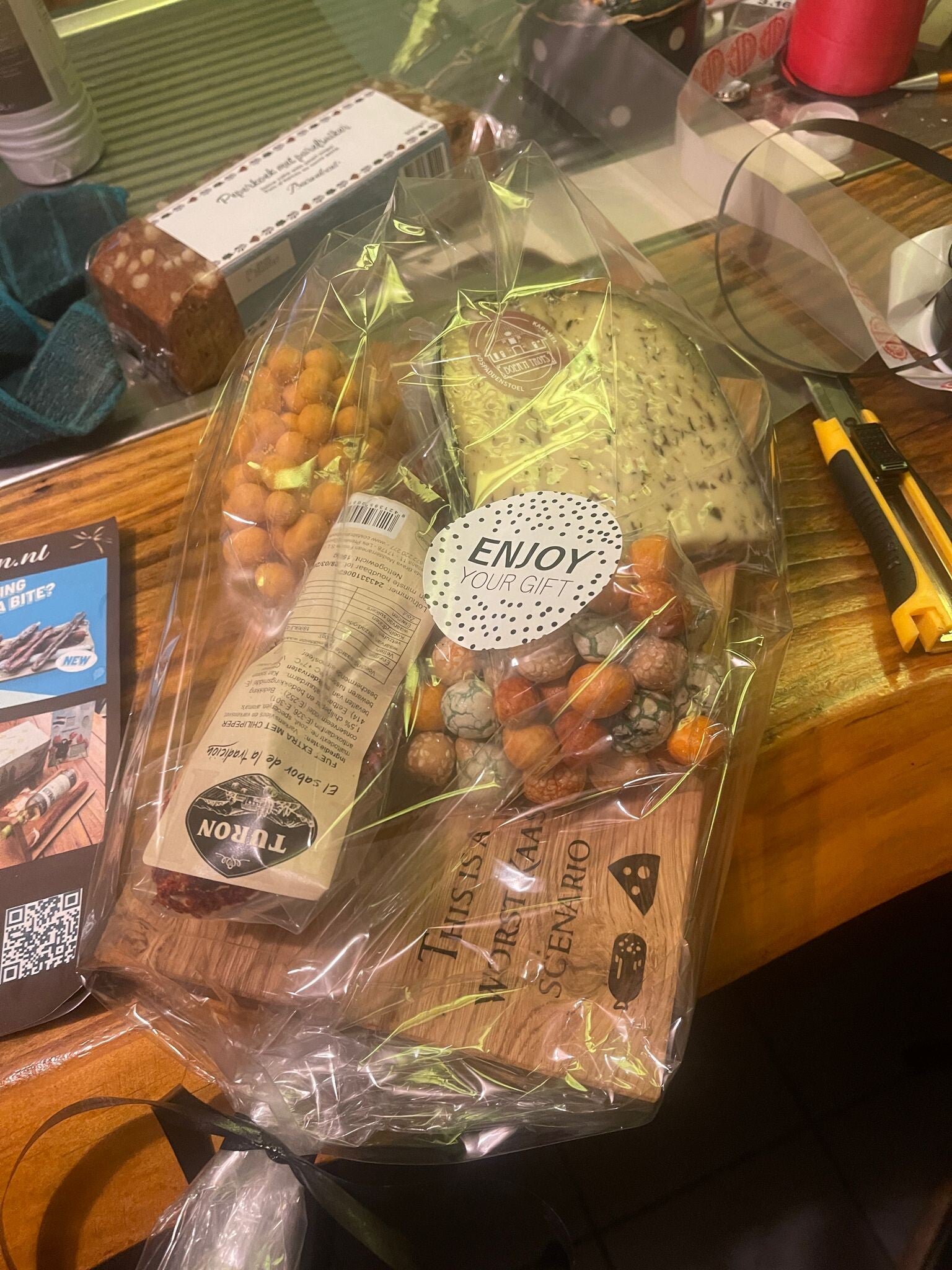 Ambachterlijk eikenhouten borrelplank Formaat. l.290 x br.180 x h.20 mm. Allerlei snoep en koek uit oma s tijd.